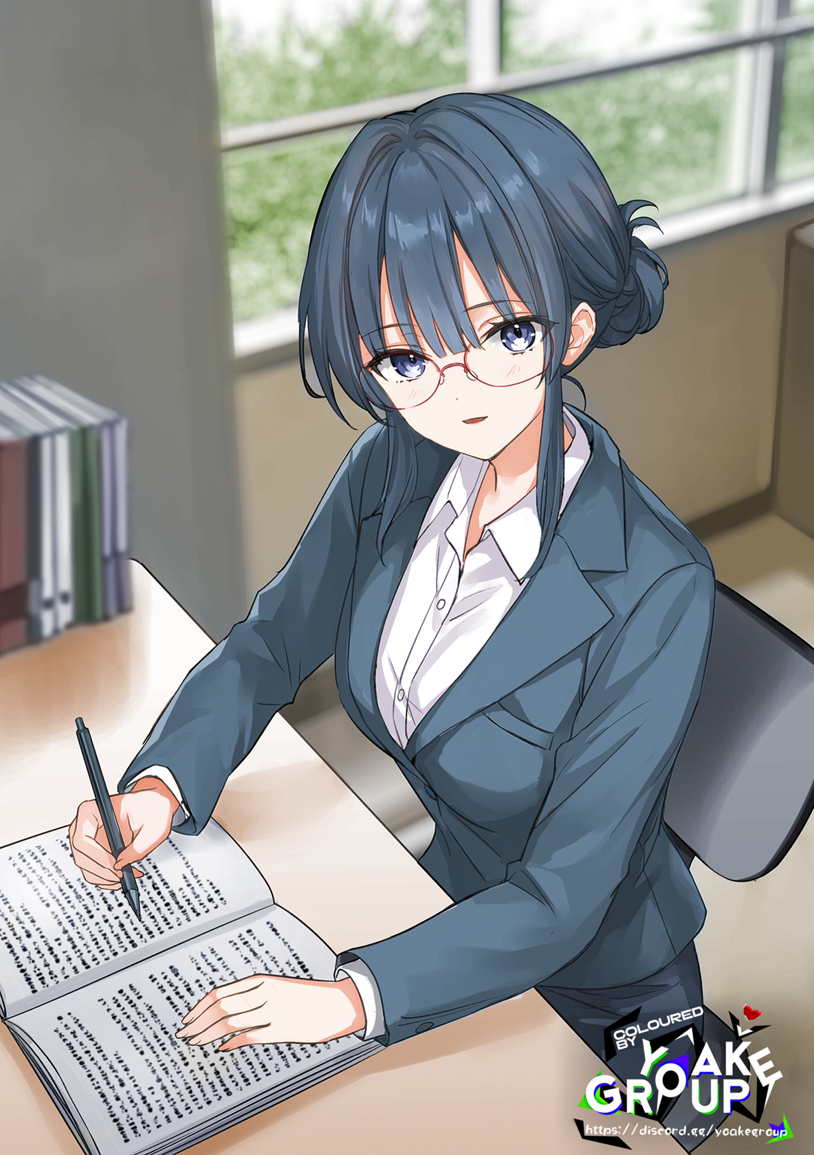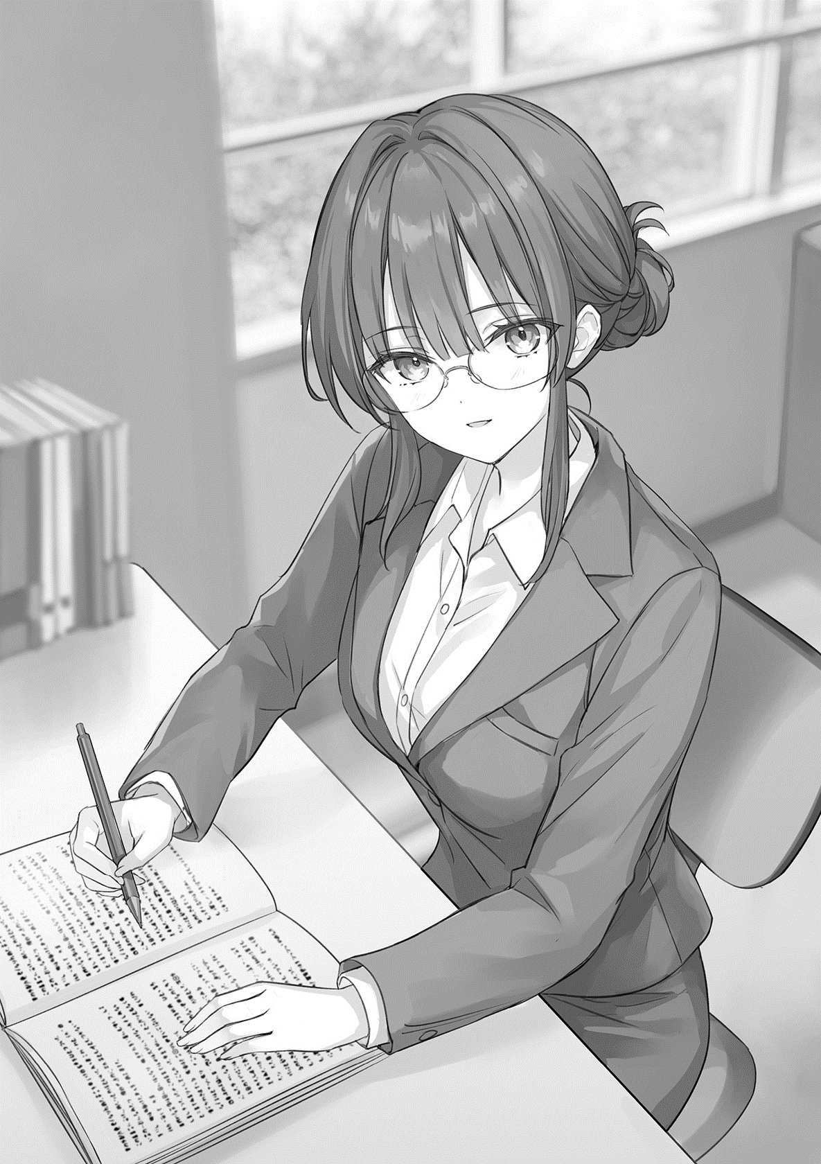 This was my homeroom teacher, Reizen-sensei. Her long black hair was elegantly tied in a bun, framing a gentle, beautiful face accented by red-framed glasses. Though she had a slender build, her chest was noticeably full. Her typical attire consisted of a navy jacket, a crisp white blouse, and a tight miniskirt. She was known for being a kind teacher, always wearing that gentle smile, which made her incredibly popular with the students. In fact, she was so beautiful that other classes were openly envious of us, but──